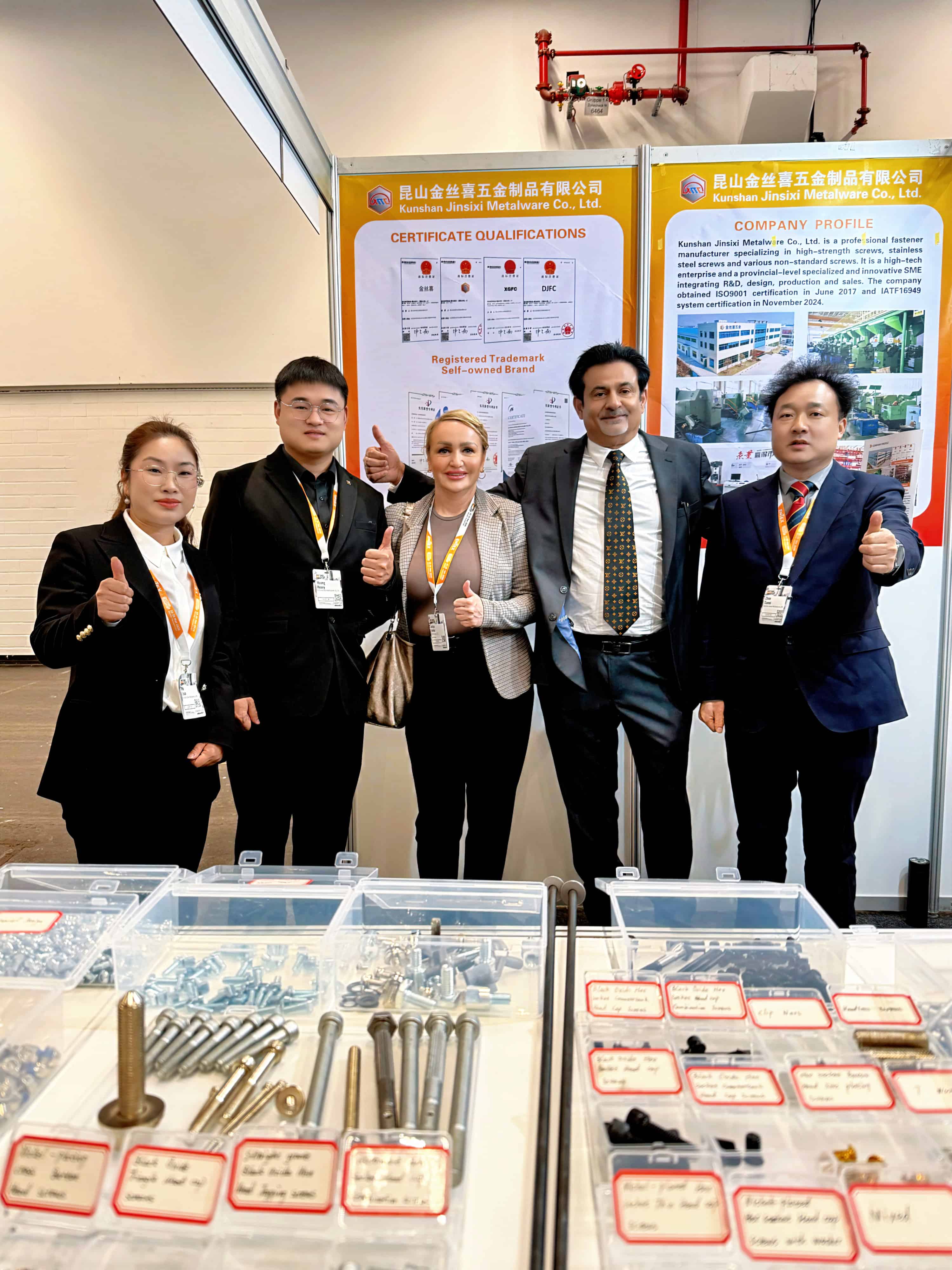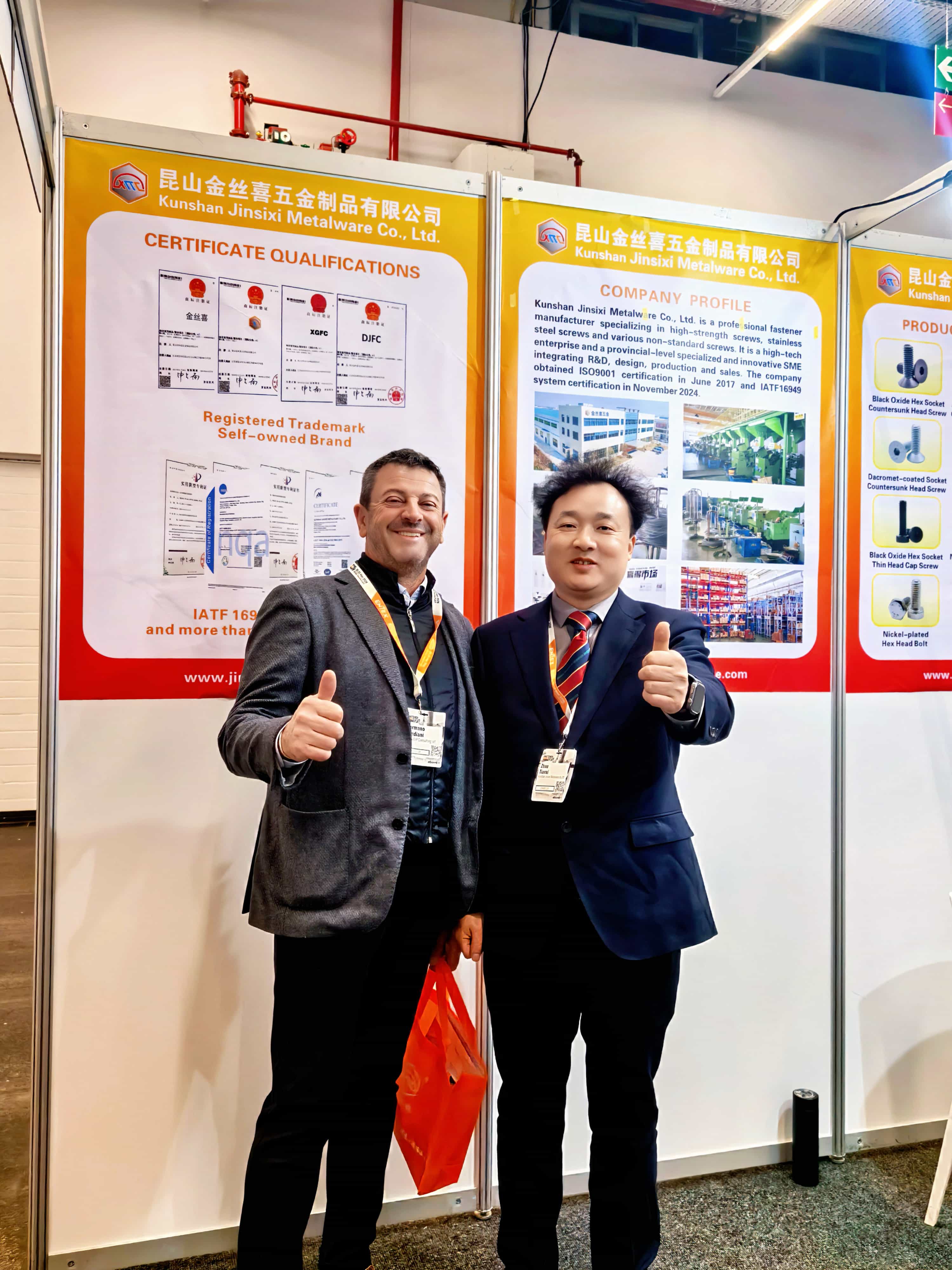 Da bi v celoti prikazal svoje celovite prednosti,Jinsixipostavili skrbno oblikovano stojnico, ki je poudarila njegovo ponudbošesterokotni nastavekinšesterokotna glavaizdelki z različnimi postopki površinske obdelave, kot so črni oksid, ponikljani, pocinkani in prevlečeni z Dacrometom. Ti izdelki so v skladu z glavnimi standardi, vključno z GB, DIN, ANSI, JIS in ISO, in so izdelani iz materialov, kot so nerjavno jeklo, srednje ogljikovo jeklo in legirano jeklo. Vsi izdelki se strogo držijo sistemov vodenja kakovosti ISO 9001 in IATF 16949, kar zagotavlja, da vsak vijak in sornik zagotavljata zanesljivo in stabilno mehansko delovanje.